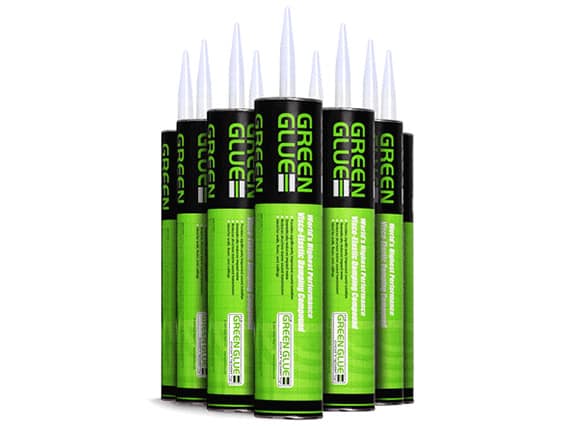 Green Glue is a viscoelastic damping compound that works to dissipate vibration caused by sound waves as they travel through ceilings, walls and floors. Very simply, when applied between two layers of rigid board material, the Compound works to greatly reduce the noise traveling from one room to the other. Unlike other sound proofing compound, Green Glue is especially effective in reducing low frequency noise common with home entertainment and theatre systems.